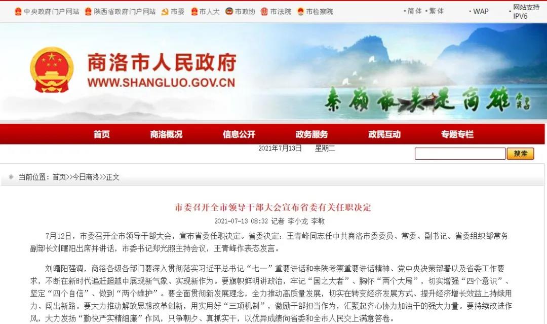 據《商洛日報》消息,7月12日,商洛市委召開全市領導干部大會,宣布省委任職決定。省委決定:王青峰同志任中共商洛市委委員、常委、副書記。